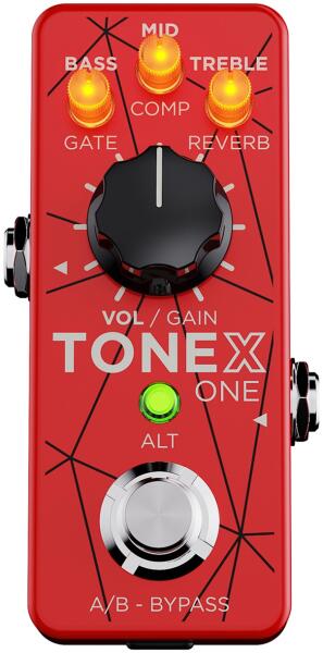 Irányítás: 1x FS, Volume/Gain, Bass/Gate, Mid/Comp, Treble/Reverb, Alt,