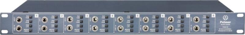 Passzív 8-csatornás DI Box, minden csatornán: 6,3 mm bemenet, 6,3 mm jack LINK/IN, 6,3 mm jack kimenet, szimmetrikus XLR kimenet, kapcsolók: PAD -10dB, PAD -20dB, GND/LIFT és MERGE/LINK-IN, speciális Merge/Link funció: az első LINK kimenet a második bemenetként használható, maximális bemeneti jel: + 54 dBu, bemeneti impedancia: 1 M Ohm 60 Hz-en, maximális kimeneti jel: 54 dBu, kimeneti impedancia: 600 Ohm, frekvenciatartomány 10 - 40000 Hz, arány: 10: 1. , méretek: 120 x 60 x 35 mm, súly: 0,284 kg