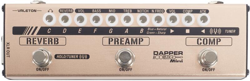 Irányítás: 3x FS, 2x Volume, Headphones, Reverb, Bass, Mid, Treb, Notch, N, Freq, Comp, ATK,